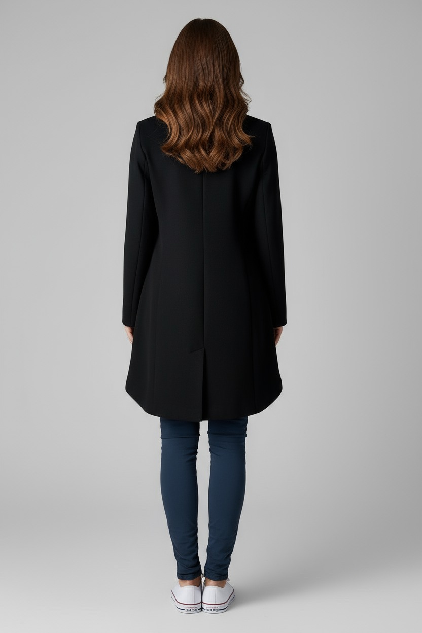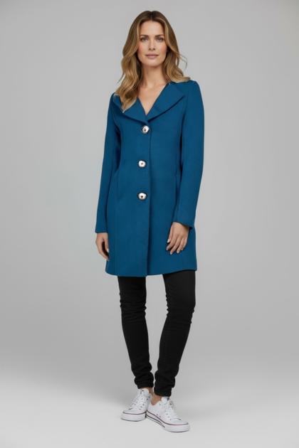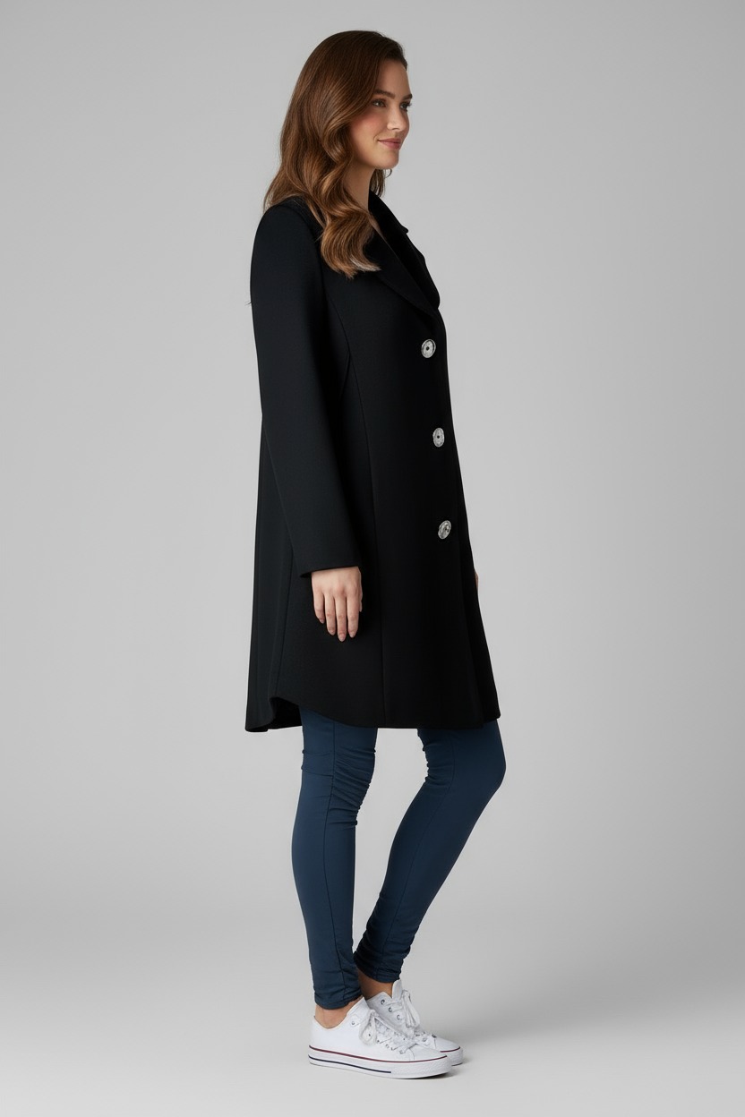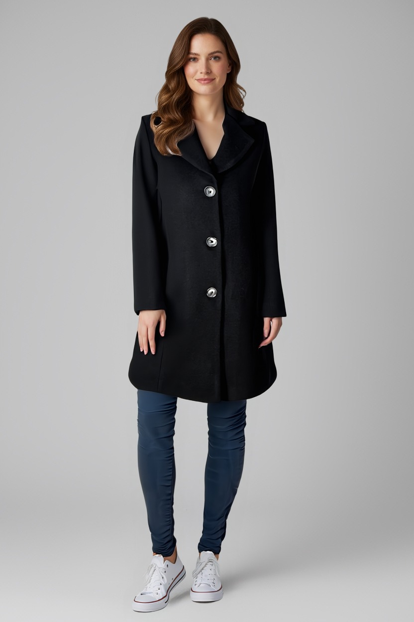 Soft and warm coat in wool , featuring a slightly fitted silhouette that flatters the figure without being too tight. Featuring wide lapels , decorative buttons , and an impeccable fit for those seeking comfort and style even in larger sizes . Perfect for completing your everyday or more elegant looks with a touch of class and femininity .