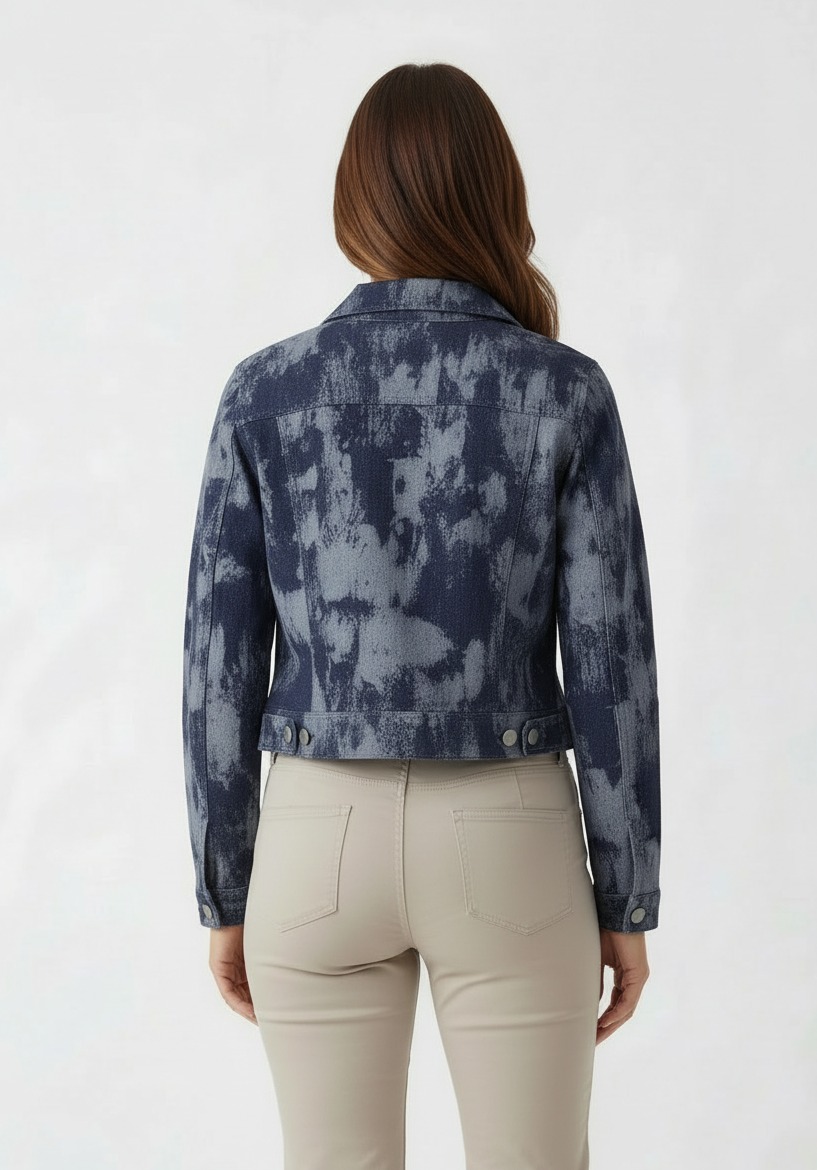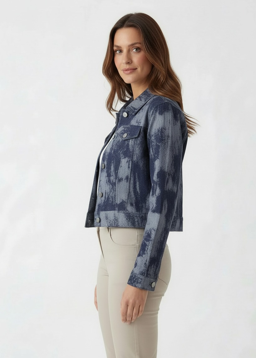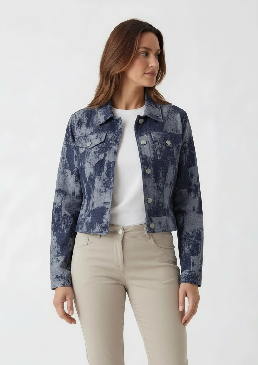 Short jacquard denim jacket with a contemporary design, featuring a refined decorative weave and a modern fit . Ideal for transitional wear, it pairs easily with trousers or skirts for a casual-chic look. Designed for the dynamic, style-conscious woman looking for a versatile piece for leisure time, the casual office, or everyday outings.