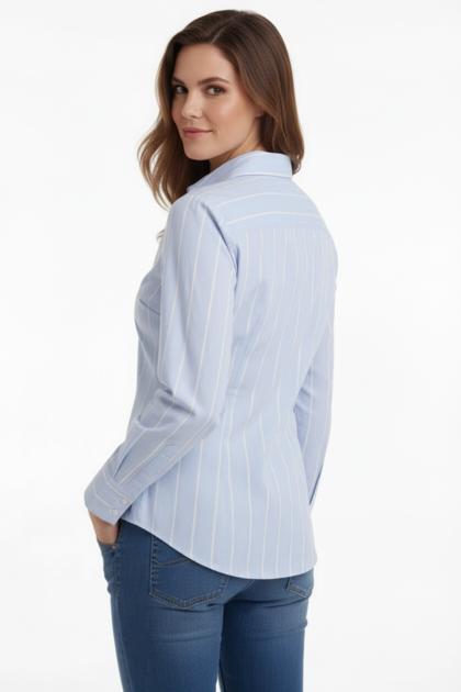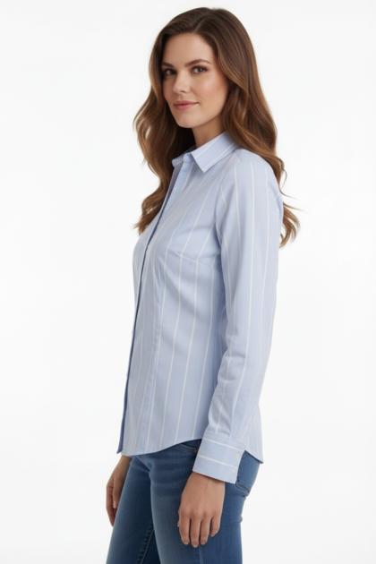 Striped cotton shirt with an open V-neck, featuring a simple, feminine design. The clean lines and natural fabric ensure everyday comfort and a versatile fit . Ideal for everyday wear, from the office to leisure time, it is designed for a practical and elegant woman who loves easy-to-match pieces, with attention to detail and suitable for any season.