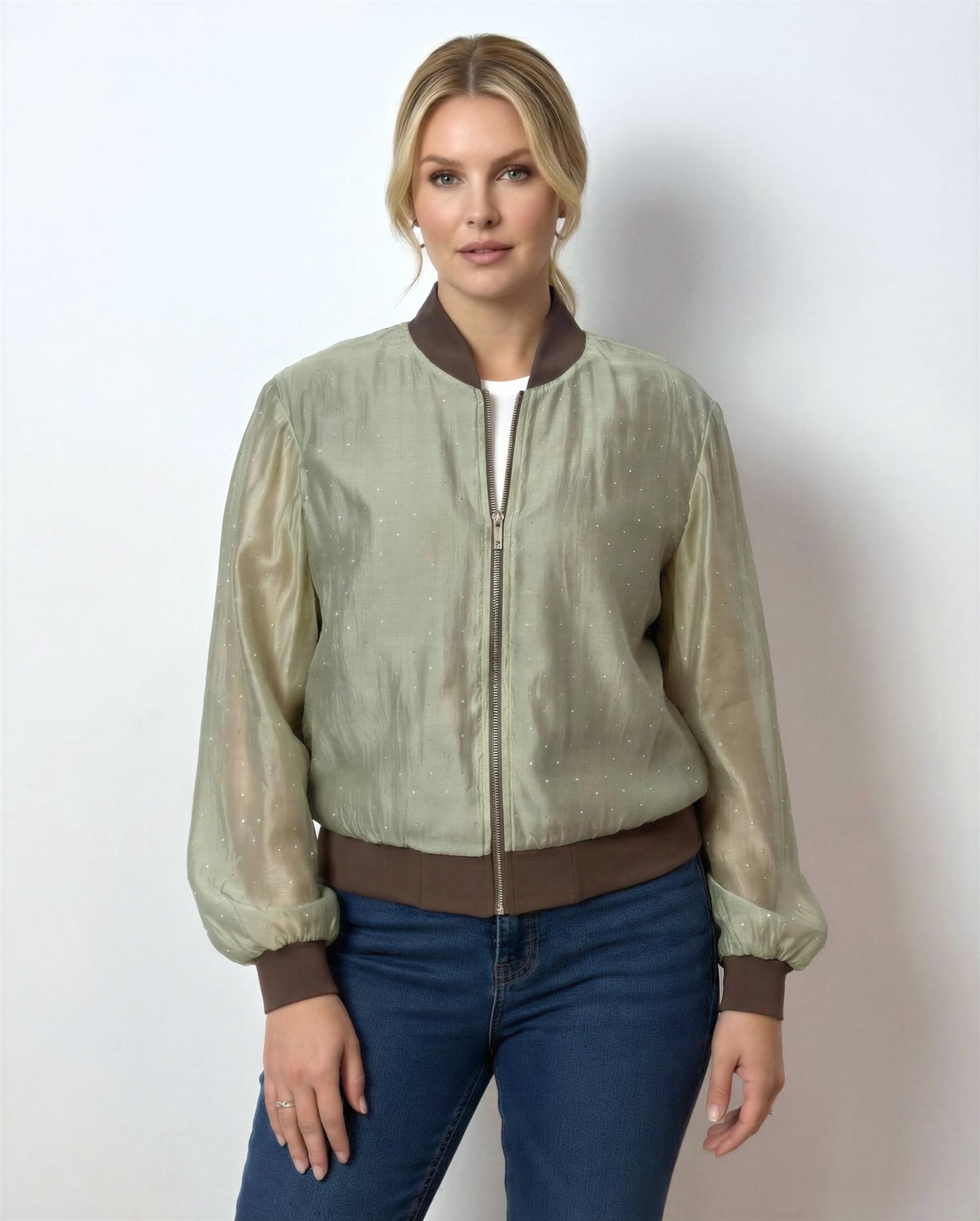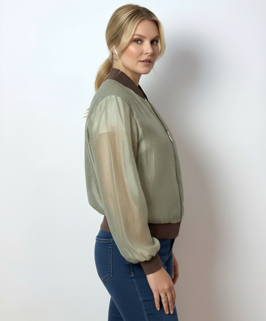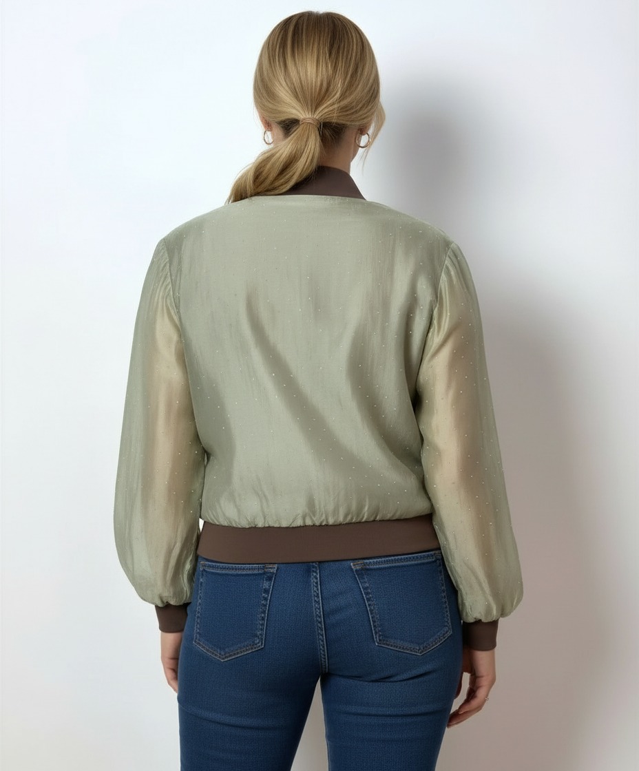 Chiffon bomber jacket with rhinestone appliqués, sheer sleeves, and a lined body for the perfect balance of style and comfort. The lightweight design ensures luminous elegance and a comfortable fit , ideal for transitional wear or special evenings. Designed for a feminine and modern woman, it's perfect for enhancing casual chic outfits or refined evening looks.