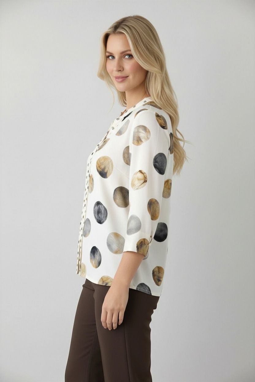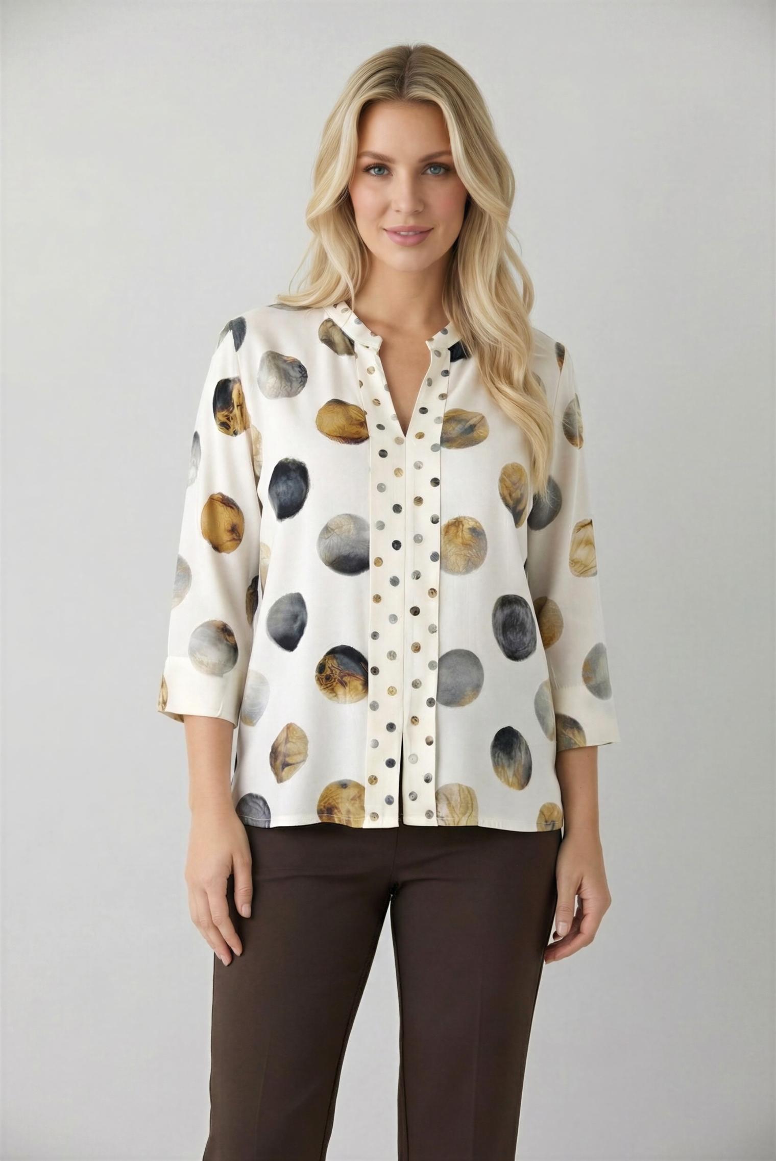 100% viscose satin blouse with a mandarin collar and double front placket, embellished with a refined interplay of large and small polka dots. The 3/4 sleeves and flowing fabric ensure understated elegance and lightweight comfort . Ideal for the office or refined leisure time, it is designed for a feminine and modern woman who loves sophisticated prints and versatile pieces.