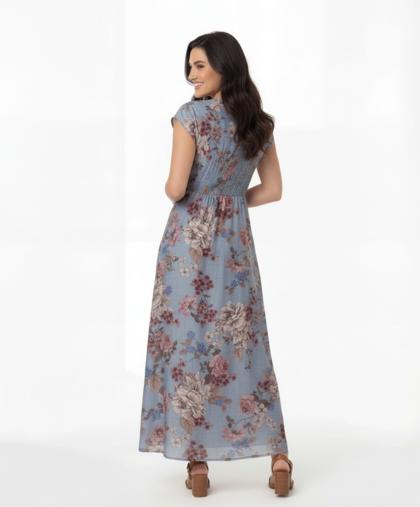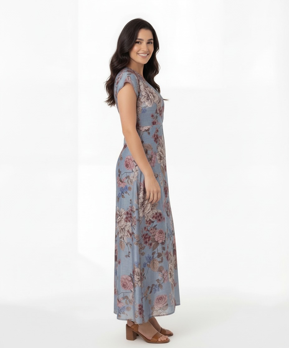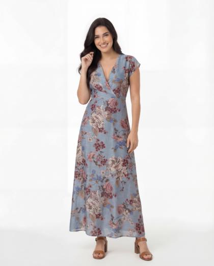 Long printed chiffon dress made of Tencel fabric, ultra-light and natural to the touch. The V-neck, underbust cut, and elasticated back create a delicate fit and a fluid fit . Ideal for summer days, travel, or elegant informal occasions, it is designed for a feminine woman who loves comfort, freshness, and natural style.