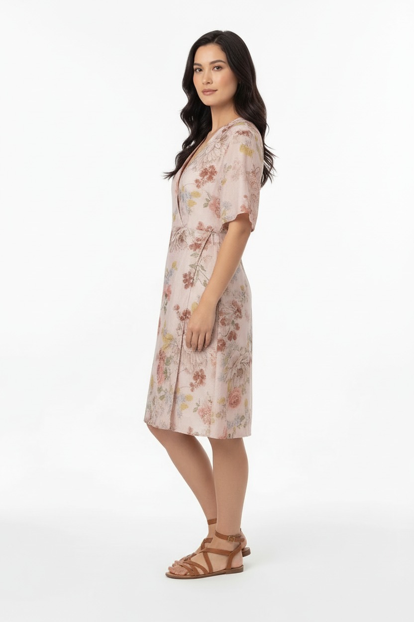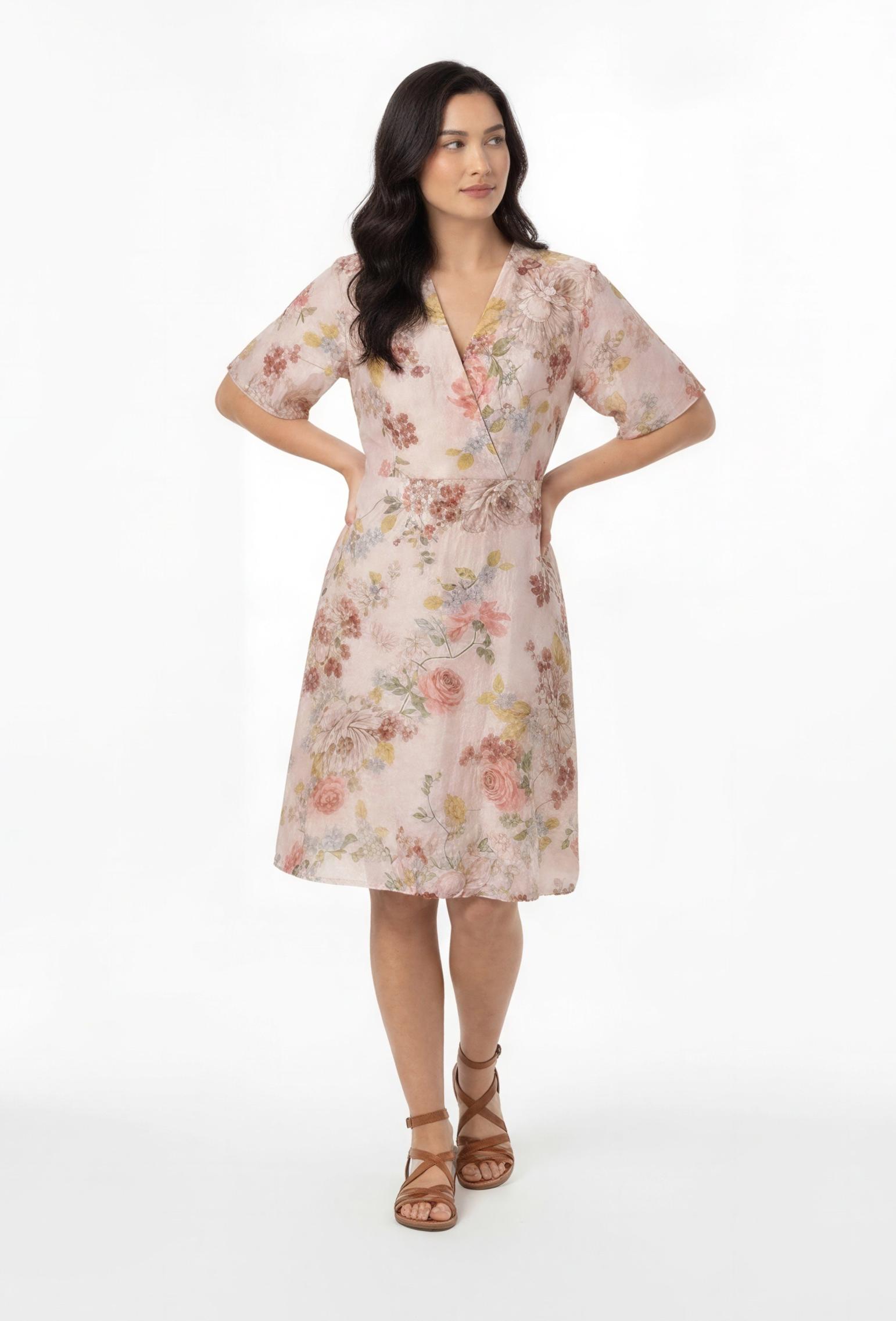 Printed chiffon dress with a wrap neckline and elbow-length sleeves, featuring a feminine and lightweight design. The elasticated back creates a delicate fit, ensuring natural comfort during wear. Ideal for transitional seasons, informal ceremonies, or elegant days, it is designed for a refined woman who loves flowing, romantic, and easy-to-wear pieces.
